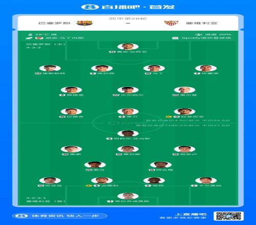 巴薩vs塞維利亞首發(fā):18歲埃斯帕特先發(fā)亞馬爾替補(bǔ),桑切斯戰(zhàn)舊主