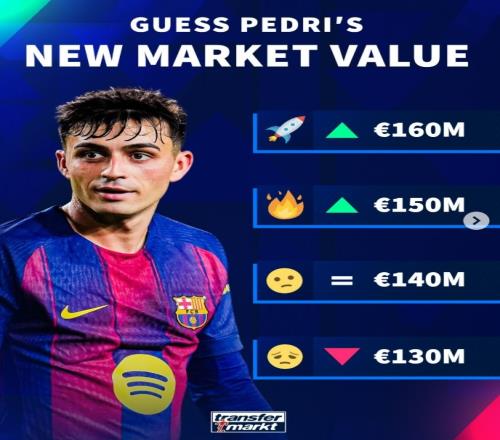 德轉(zhuǎn)預(yù)熱佩德里身價(jià)可能變化:最高漲至1.6億歐,最低1.3億歐
