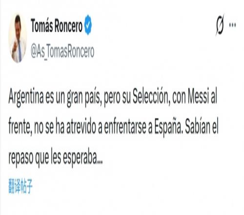 龍賽羅在社媒寫道:阿根廷是個偉大的國家,但由梅西領(lǐng)銜的阿根廷國家隊(duì),卻不敢直面西班牙。他們知道等待他們的將是什么...