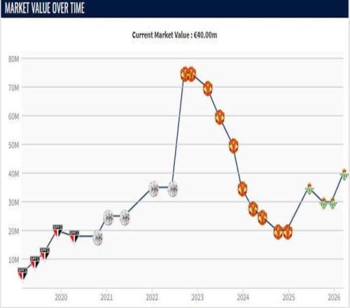 這位巴西邊鋒的巔峰身價(jià)是2022年9月的7500萬(wàn)歐元,那年夏窗,他以9500萬(wàn)歐元的轉(zhuǎn)會(huì)費(fèi)從阿賈克斯轉(zhuǎn)會(huì)曼聯(lián),不過(guò)自那之后,由于表現(xiàn)不佳,他的身價(jià)一直在下跌,在曼聯(lián)時(shí)曾跌到了2000萬(wàn)歐