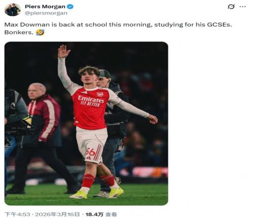 體育播報(bào)03月16日宣 今天是周一,英國(guó)名嘴、著名阿森納球迷皮爾斯·摩根社媒發(fā)帖,調(diào)侃阿森納16歲小將道曼今天還要去上學(xué)。