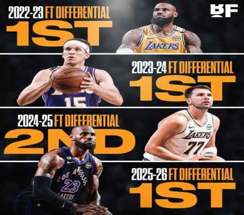 湖人與對(duì)手罰球差近4賽季第3次第一最多1賽季比對(duì)手多507個(gè)罰球