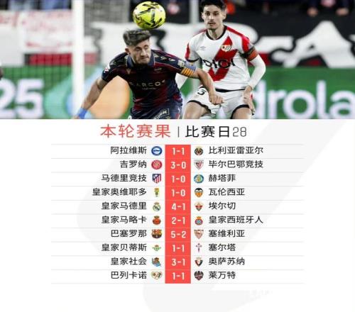 北京時(shí)間3月17日凌晨,巴列卡諾1比1戰(zhàn)平萊萬(wàn)特,西甲聯(lián)賽第28輪十場(chǎng)比賽全部結(jié)束較量。本輪巴薩5比2大勝塞維利亞,皇馬同樣4比1輕取埃爾切,目前巴薩積70分繼續(xù)位列榜首,皇馬則積66分排名第2。馬德里競(jìng)技本輪贏球,1比0擊敗赫塔費(fèi),由于比利亞雷亞爾1比1戰(zhàn)平阿拉維斯,馬競(jìng)獨(dú)享聯(lián)賽第3的位置,但排名第4的黃潛已經(jīng)領(lǐng)先第5的皇家貝蒂斯已經(jīng)多達(dá)11分。