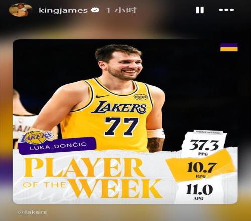 就在早些時(shí)候,東契奇當(dāng)選西部周最佳球員,幫助湖人先后擊敗森林狼、公牛和掘金。他場均出戰(zhàn)38.3分鐘,得到37.3分,投籃命中率46.9%,三分命中率42.5%,罰球命中率79.2%,同時(shí)貢獻(xiàn)10.7個(gè)籃板、11.0次助攻、2.0次搶斷和1.7次蓋帽。這位27歲的球星在這三場比賽中砍下兩次三雙、一次兩雙,并貢獻(xiàn)了他加盟湖人后的首個(gè)50+得分表演。詹姆斯也第一時(shí)間為隊(duì)友送上祝賀。
