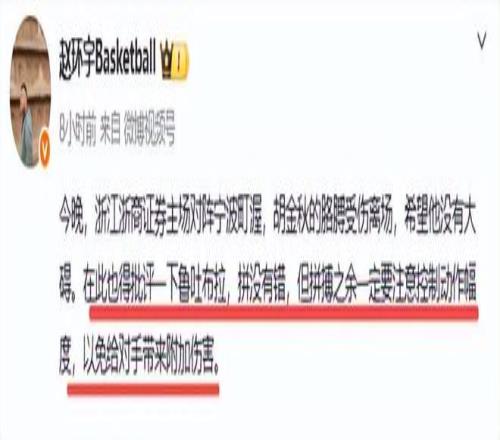 記者趙環(huán)宇也怒批魯吐布拉,“浙江浙商證券主場(chǎng)對(duì)陣寧波町渥,胡金秋的胳膊受傷離場(chǎng),希望他沒(méi)有大礙。在此也得批評(píng)魯吐布拉,“拼沒(méi)有錯(cuò),但拼搏之余一定要注意控制動(dòng)作幅度,以免給對(duì)手帶來(lái)附加傷害。”