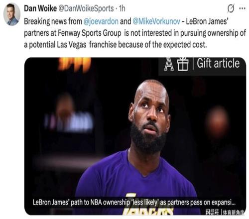 近日,NBA官方宣布了其在拉斯維加斯和西雅圖增設(shè)兩支新球隊的擴軍計劃。今日,NBA資深記者Dan Wokie發(fā)表了一篇深度報道,標題為《合作伙伴退出擴軍競標,詹姆斯獲取NBA球隊所有權(quán)之路受阻》。報道內(nèi)容如下: