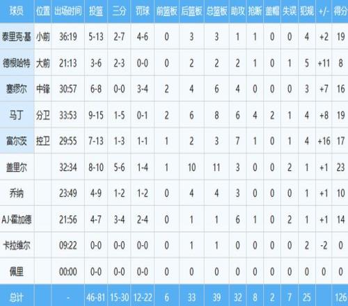 此役富爾茨投籃13中7,其中三分3中1砍下17分3板7助1斷,正負(fù)值+16。