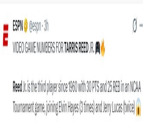 此役身高2.11米的小塔里斯-里德,34分鐘,15中12,罰球9中7,拿到31分27籃板3助攻,命中率80%,這場(chǎng)比賽打出了NCAA生涯最高的一場(chǎng)比賽。