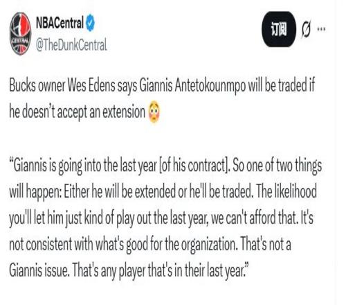 雄鹿老板韋斯-埃登斯接受ESPN采訪時(shí),明確表示下賽季為字母哥的準(zhǔn)合同年(27-28賽季擁有球員選項(xiàng)),球隊(duì)不可能承擔(dān)如此風(fēng)險(xiǎn)。