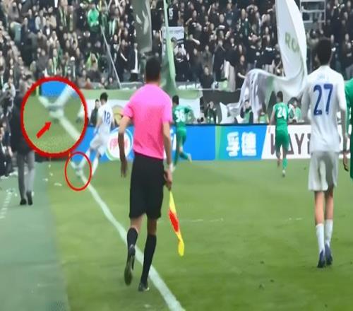 那么,這位申花主帥的抱怨有沒(méi)有道理,球是不是真如他所看到的那樣根本沒(méi)出界呢?答案很快就給了出來(lái)。轉(zhuǎn)播畫(huà)面放出劉誠(chéng)宇帶球的過(guò)程片段(下圖),不過(guò)這個(gè)重放畫(huà)面的速度還是太快,外界難以看出是不是出界。