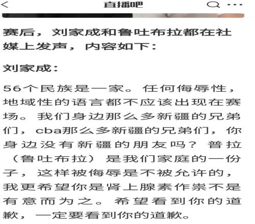 下面再來看看兩位當事人是怎么說的,賽后劉總和魯吐布拉都在個人社媒上發(fā)文怒斥李祥波,劉總表示:56個民族是一家。任何侮辱性,地域性的語言都不應該出現(xiàn)在賽場