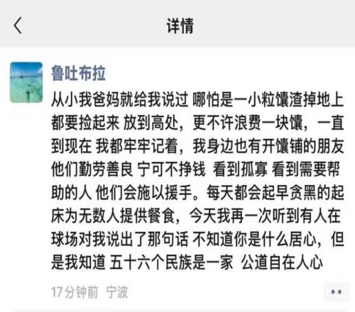 在救護車上一邊接受治療,一邊拿起手機發(fā)文聲討李祥波的魯吐布拉表示:從小我爸媽就給我說過,哪怕是一小粒馕渣掉地上都要撿起來,放到高處,更不許浪費一塊,一直到現(xiàn)在我都牢牢記著,我身邊也有開馕鋪的朋友,他們勤勞善良,寧可不掙錢,看到孤寡,看到需要幫助的人,他們會施以援手。每天都會起早貪黑的起床為無數(shù)人提供餐食,今天我再一次聽到有人在球場對我說出了那句話,不知道你是什么居心,但是我知道五十六個民族是一家,公道自在人心。