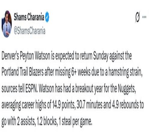 掘金前鋒佩頓-沃特森因右腿腿筋拉傷缺席六周多后,預(yù)計將在周一對陣波特蘭的比賽中復(fù)出、可以登場。