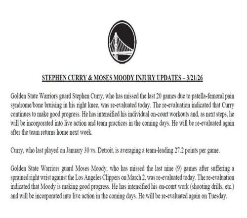 北京時間3月22日,過去一夜,一些球員的傷情更新,其中包括庫里和特雷-楊。具體如下——