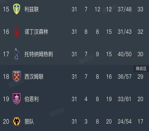 英超降級(jí)區(qū)積分榜情況