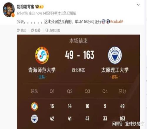 中國(guó)籃壇又出現(xiàn)大比分分差了。近日,在CUBAL聯(lián)賽上又再次出現(xiàn)夸張分差。太原理工大學(xué)(以下簡(jiǎn)稱太原隊(duì))客場(chǎng)挑戰(zhàn)青海師范大學(xué)(以下簡(jiǎn)稱青海隊(duì))。這是一場(chǎng)毫無懸念的比賽,雙方首節(jié)便拉開了26分的分差,半場(chǎng)太原隊(duì)已經(jīng)手握53分領(lǐng)先優(yōu)勢(shì)。雙方經(jīng)過四節(jié)比賽后,太原隊(duì)最終以163-49狂勝青海隊(duì)114分,締造了CUBAL聯(lián)賽又一大慘案。