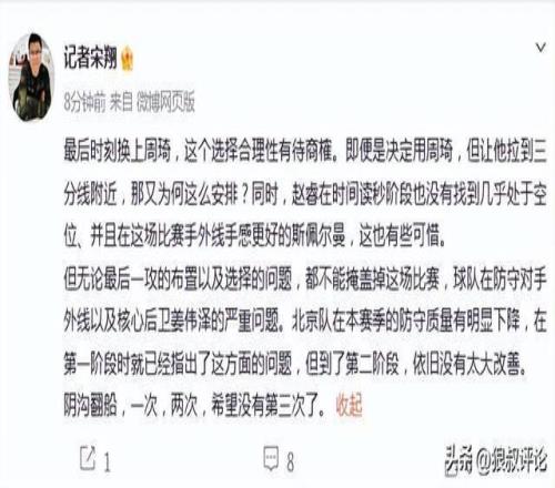 場上有趙睿、陳盈駿、斯佩爾曼,場下坐著麥基、杰曼,最后就差2分的絕殺戰(zhàn)術(shù)是給周琦投三分?不過仔細想想這球北京隊也不是輸在了最后時刻,前面有太多看不懂的內(nèi)容了。