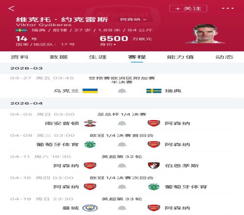 4天后,約克雷斯將回到俱樂部,阿森納將在月初接連出戰(zhàn)足總杯、歐冠,約克雷斯將面對自己的老東家葡體。此后回到英超聯(lián)賽,阿森納4月19日將迎來客戰(zhàn)曼城的爭冠焦點(diǎn)戰(zhàn)。