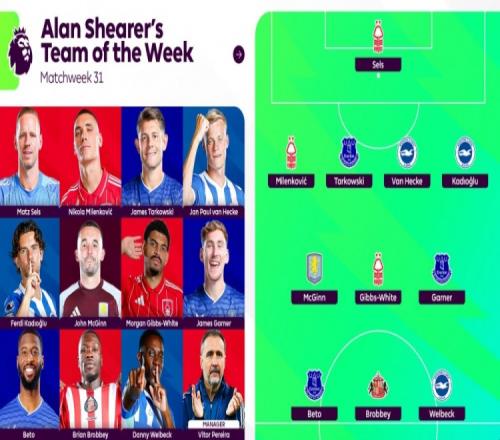體育播報(bào)3月23日宣 英超第31輪戰(zhàn)罷,阿蘭·希勒評(píng)選了本輪最佳陣容,貝托、吉布斯-懷特、維爾貝克在列。