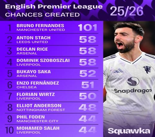 體育播報3月24日宣 本賽季,曼聯(lián)隊長B費在創(chuàng)造機會方面有著上佳表現(xiàn)。根據(jù)Squawka的數(shù)據(jù)統(tǒng)計,葡萄牙中場在英超共創(chuàng)造101次機會遙遙領先,斯塔赫、賴斯和索博斯洛伊以58次并列次席。