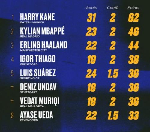 8、上田綺世(費(fèi)耶諾德,22球,系數(shù)1.5):33分