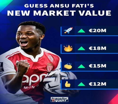 德轉(zhuǎn)將在3月27日更新法甲球員身價,他們也對目前身價1000萬歐元的法蒂進(jìn)行了一次身價預(yù)熱,他們給出了四個上漲選項,分別為上漲至2000萬歐元、1800萬歐元、1500萬歐元以及1200萬歐元。