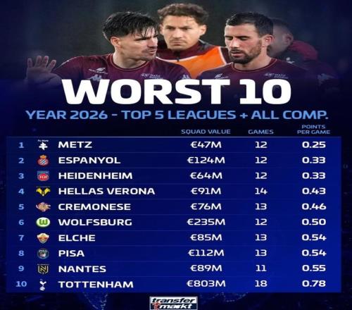 2026年五大聯(lián)賽球隊場均積分最低:梅斯倒數(shù)第1,熱刺上榜