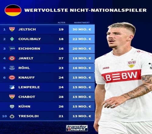 在德轉公布的身價榜單中,斯圖加特的19歲球員耶爾奇以3000萬歐元居首;不萊梅的庫利巴利以2200萬歐元位居第二;來自柏林赫塔的16歲小將艾?;舳饕?000萬歐元排名第三。
