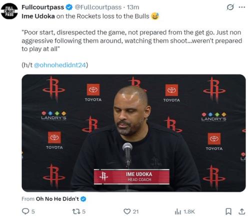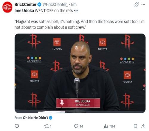 烏度卡炮轟裁判是軟蛋!休媒高呼輸球不怪他火箭角色球員28中10