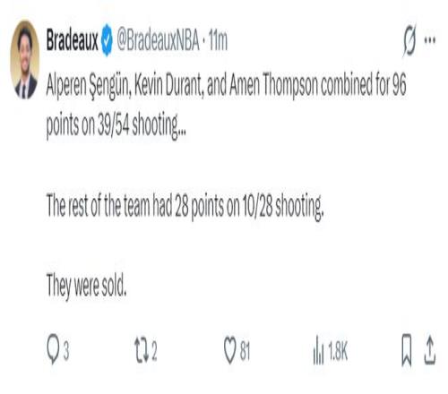 休媒談到這場(chǎng)比賽的失利:杜蘭特40分火箭生涯最高分,申京19中16拿到33+13+10,我真的不敢相信輸給公牛這種球隊(duì) ,他們過(guò)去25場(chǎng)只贏了5場(chǎng)吧。