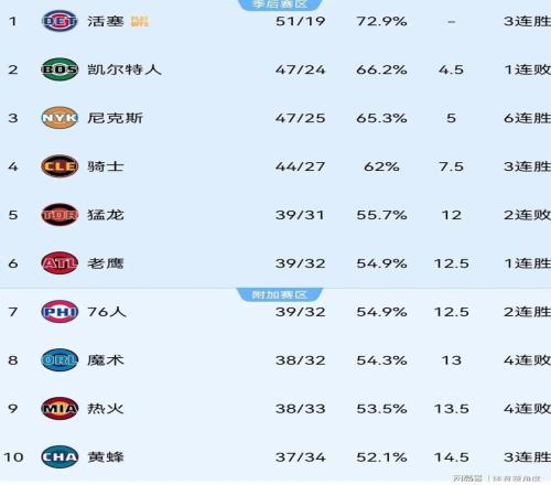 當(dāng)前,在東部常規(guī)賽戰(zhàn)績(jī)上排在猛龍隊(duì)前面的球隊(duì)分別是活塞隊(duì)(51勝19負(fù))、凱爾特人隊(duì)(47勝24負(fù))、尼克斯隊(duì)(47勝25負(fù))和騎士隊(duì)(44勝27負(fù))。