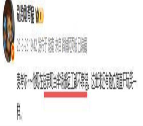 別跑剛背豬究竟批的是誰呢?沒錯,他批的是打首發(fā)的小外援麥考爾。昨晚在三個小外援中,表現(xiàn)最差的是麥考爾,他根本打不了控衛(wèi),很難串聯(lián)球隊,很難組織起有效的戰(zhàn)術(shù),多余動作太多太難看,突破又突不起,毫無殺傷力,全場只有兩次罰球,可以說殺傷力為0。沒突破,沒三分,沒組織,貨真價實的三無小外援,要這樣的外援有何用?也難怪媒體人怒批麥考爾這表現(xiàn)當(dāng)半場搬運工都不靠譜。其實這位關(guān)心廣東隊的媒體人,早在第一階段就建議裁掉正在養(yǎng)傷的麥考爾?,F(xiàn)在看來杜鋒讓他留下,就是一個大錯誤。