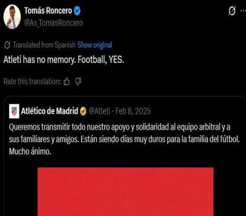 北京時間3月25日,《阿斯報》主編龍賽羅在個人社交媒體上轉(zhuǎn)發(fā)了一條馬德里競技于2025年2月8日發(fā)布的支持西甲裁判的帖子,以此諷刺馬競近期在德比賽后對裁判判罰的不滿。
