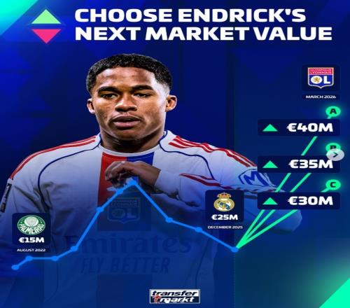 恩德里克本賽季由皇馬租借至里昂之后發(fā)揮出色,9次法甲出場(chǎng)貢獻(xiàn)3球4助攻,19歲的他目前身價(jià)2500萬歐,德轉(zhuǎn)給出其更新后的身價(jià)選項(xiàng)分別是4000萬歐、3500萬歐以及3000萬歐。
