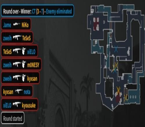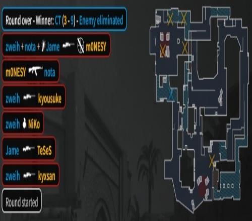 半場結束前最后一回合,PV雙狙防守,zweih大狙架B二樓先殺K3,上帝在A轟掉龍哥,Zweih手雷炸飛Niko后單B四殺,PV以9-3結束上半場,Niko半場結束戰(zhàn)績0-9顆粒無收。