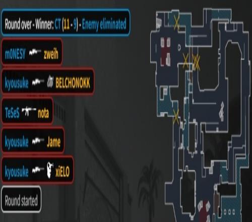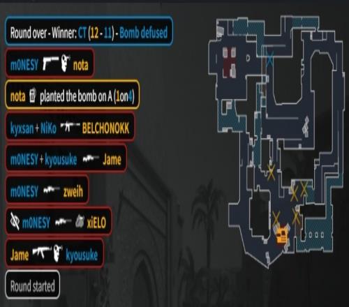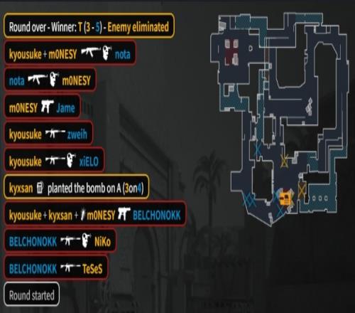 第8回合獵鷹四把Tec-9來A,KK長箱雙殺龍蝦二人后被換,京介撿起M4A1爆轟三殺,獵鷹在A下包,京介單局四殺,獵鷹拿到第3分。
