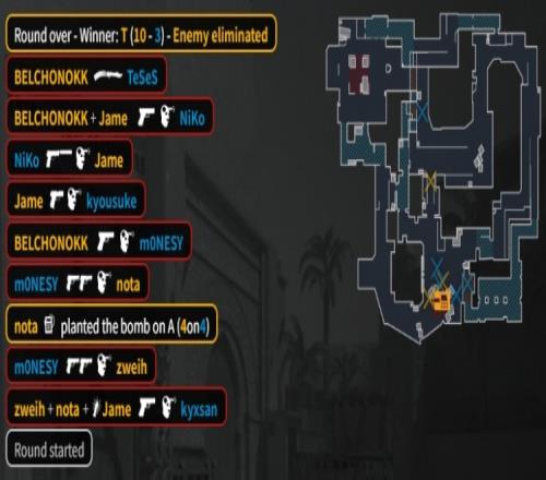 第10回合獵鷹三人來A1進點,zweih爆轟三殺,上帝一槍轟掉A二樓想跑的Niko,后者戰(zhàn)績0-7,PV拿到第7分。