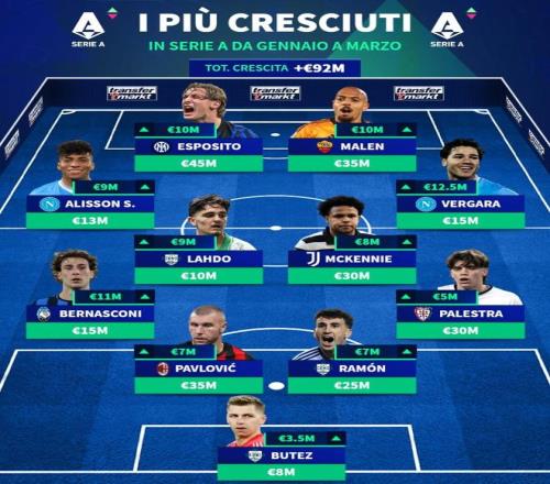 北京時間3月29日,在更新了意甲球員的身價之后,德轉(zhuǎn)列出了此次更新身價上漲最佳11人陣容,皮奧-埃斯波西托領(lǐng)銜,馬倫、麥肯尼、帕夫洛維奇在列。