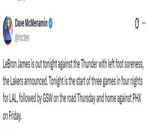 詹姆斯左腳酸痛缺戰(zhàn)雷霆!湖人三巨頭集體缺陣上次交鋒狂輸43分