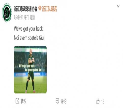 今天,浙江綠魂球迷協(xié)會發(fā)文支持米特里策,該球迷協(xié)會在官方微博用英語和羅馬尼亞語寫道:我們支持你。