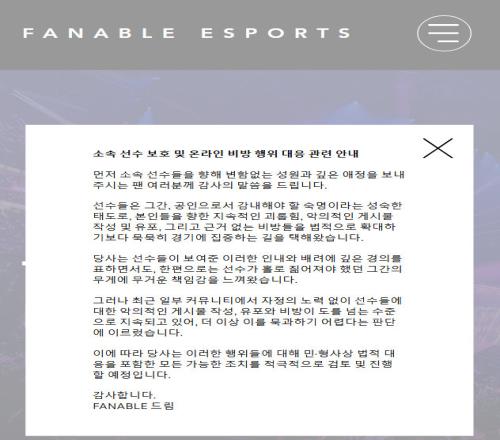“首先,向一直以來給予所屬選手不變的支持與深厚喜愛的各位粉絲表示衷心的感謝。