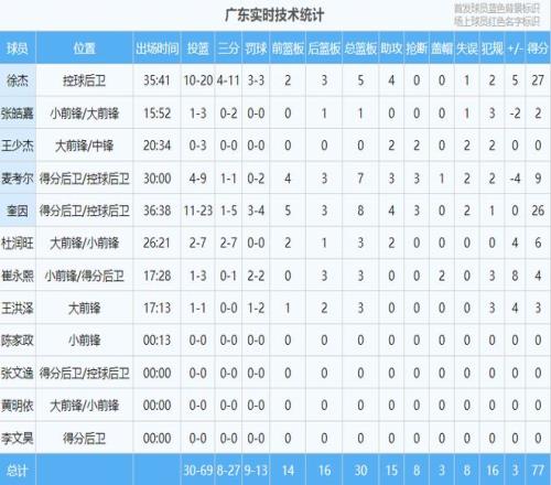 賽后,廣東隊(duì)球員數(shù)據(jù)統(tǒng)計(jì):徐杰27分5板4助、奎因26分8板4助3斷、麥考爾9分7板3助3斷、杜潤旺6分3板2助、崔永熙4分3板2帽、王洪澤3分3板、張皓嘉2分1板、王少杰2助2斷。