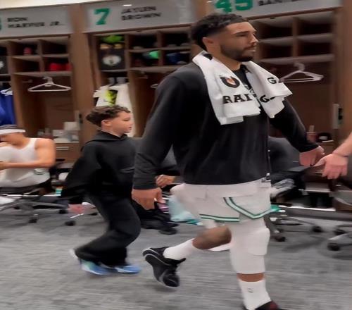 在比賽結束后在球館內(nèi)接受了球迷們歡呼的綠凱球員們緩緩地回到更衣室,塔圖姆帶著自己的兒子Deuce進入更衣室等待主帥馬祖拉的復盤。Deuce早就是綠凱更衣室的常客。