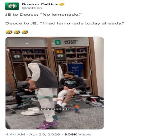 杰倫-布朗是最后一個進入更衣室的,布朗與隊友們一一擊掌后來到Deuce的跟前,布朗逗趣Deuce,他說道“我們沒有檸檬水了!”Deuce回答“我已經(jīng)喝過檸檬水了。”【從這一點就能看出雙探花的感情非常之好】